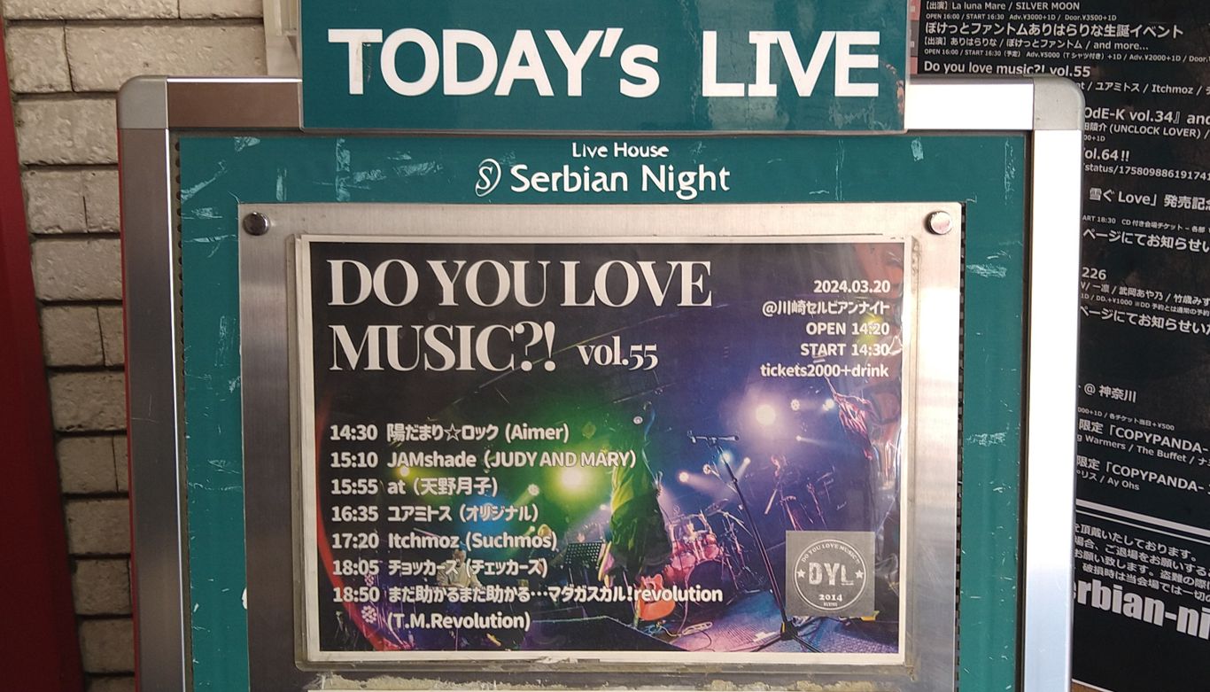 5年ぶりですってよ! ユアミトス出演、川崎セルビアンナイトでの『Do you love music?! vol.55』にお邪魔してきました。 SNSの「note」をきっかけに追いかけるようになった楽団「ユアミトス」さんご出演、しかも5年ぶりとなったら行かないわけにも行きませんね……! セルビアンナイト、JR川崎駅からめちゃくちゃ行きやすくて最高でした。 地下街の36番出口から行けば分かりやすいよ、とXのふぉろわに教えて頂いていたんですが、信号とか渡ることなくひたすら真っ直ぐですぐ着く。 最高すぎる。 初めて行くところだと目的のライブハウスを必死になって探して、着く頃には神経すり減らしてちょっと疲れているときもあるので行きやすいところはめちゃくちゃありがたい。 ともあれ、16時35分からユアミトスさんの出番でしたので、16時着で会場をうろうろ。 うろうろしていたらユアミトス出番前にユアミトスさんのボスこと政美さん(リンク先はX)に捕捉されました。今回もしっかりご挨拶できてよかったです。 ……いつも思うけど人が多いところでよくこちらに気づくなと感動……今回は特にマスクしてたのに……つよい…… 今回のライブは事前にセットリストが公開されていたので、しっかり予習して挑めました〜! セットリスト(1〜5タイトルはyoutubeリンク) 1、サンカヨウ 2、紫陽花 3、灯火 4、san skia 5、Super attractor 6、咲く星々(新曲) この中でライブ初お目見えはサンカヨウ、紫陽花、san skia、新曲ですかね。 どれもライブが無かった期間に発表された楽曲たちです。 全6曲でした。 ホント! 6曲だとライブ時間はあっという間でしたね! ライブのスタートはいつもどおりのインスト。 この曲が始まってステージ上にメンバーが揃って、フロアがじっと静まるあの空気は何度体感してもたまりません。 そして、ピアノからスタートを切る『サンカヨウ』。 この曲はBメロとサビの間の加速する感じがとても好きなのですが、音源とライブの違いといえばやはり、それを音の振動として文字通り体感するところでしょうか。力強くなっていく演奏を音圧として感じるというか。 プラスして、大サビ前のCメロのコーラスにバイオリンのぼってぃさんが参加する生っぽさもライブの醍醐味ですね。 ぼってぃさんのバイオリン好きなんですけど、歌もすごい好きなんですよね。ボーカルHarunaさんの儚い歌声に少し強さが加わりますよね。 それに、サンカヨウの最後の最後、ピアノとバイオリンのメロディーで艶っぽく終わって行くのも、音源だと寂しい感じがありますがライブだと巣立ってどこかに新しく歩き出して行くような、背中を押される感じがあり。 ライブで改めてじっくり聴くと、こちらの楽曲の提供先のゲームのストーリーもイメージソングの元となったキャラクターは知らないのでそこは申し訳ないのですが、寂しさを感じる曲でありつつ寄り添う温かさのある曲だなぁ、としみじみ感じたのでした。 2曲目の『紫陽花』もライブ演奏は初めてだったような。 こちらはピアノが駆け巡るアップテンポな曲ですが、やはりライブだと力強いのはロックバンド編成の男性陣! ライブだといつも聴いてる曲の表情ががらりと変わって、そこがユアミトスのライブに行く一番の理由でもあるのですが、今回はこれがまさにそうでしたね……! もう違う曲だよ!(そんなことはないよ) 音源だと後ろ髪を引かれるようなそんな心地の曲なんですが、ライブ演奏だと一緒に歩いていってくれるような前を向ける気持ちになりました。むしろ前しか向けなさそう。 ライブ音源、散歩しながら聴きたい。曲名は紫陽花だけど春の陽気の公園散歩のおともにぴったりじゃないですかね。 と、サンカヨウ、紫陽花はしっとりめの2曲、続く灯火はユアミトス屈指の名曲バラードです。 もう灯火の話は前のライブでもさんざんしたような気がするので割愛します。もうすでにだいぶ長いので……! あ、でもこれだけ。こちらの曲は女子ミトスメンバーのみの構成なんですが、今回は男性陣は背後でそっと立っていらっしゃいましたね……(ステージから撤退して楽曲終わるとそっと戻ってくるパターンもある)。 でも、数年を経てピアノ、バイオリンともに演奏が力強くなっていっている気がして、意外と切ないバラードだけじゃなくて、恋の喜びと切なさを歌う花咲く春の歌でもあるのかな、なんて思ったりもして。 まぁ、その時の気持ちによっても曲は聞こえ方が変わるからなぁ……不思議ですよねぇ。 そして、4曲目『san skia』。 この曲を今回のライブで一番楽しみにしていました! サビに入る前、大サビ前、大サビ後の楽曲ラストにドラマチックな展開を持つ曲なので、生で聴いたら絶対に楽しいだろうな、と! もうめちゃくちゃ最高でしたね。 Cメロのしっとり入るボーカルから最後にかけて力強さを増していく歌声を生演奏でより感じる。 この曲では大サビ後の最後の最後のメロディーラインがとっっっても好きなんですが、ここを生で聴けて良かった…