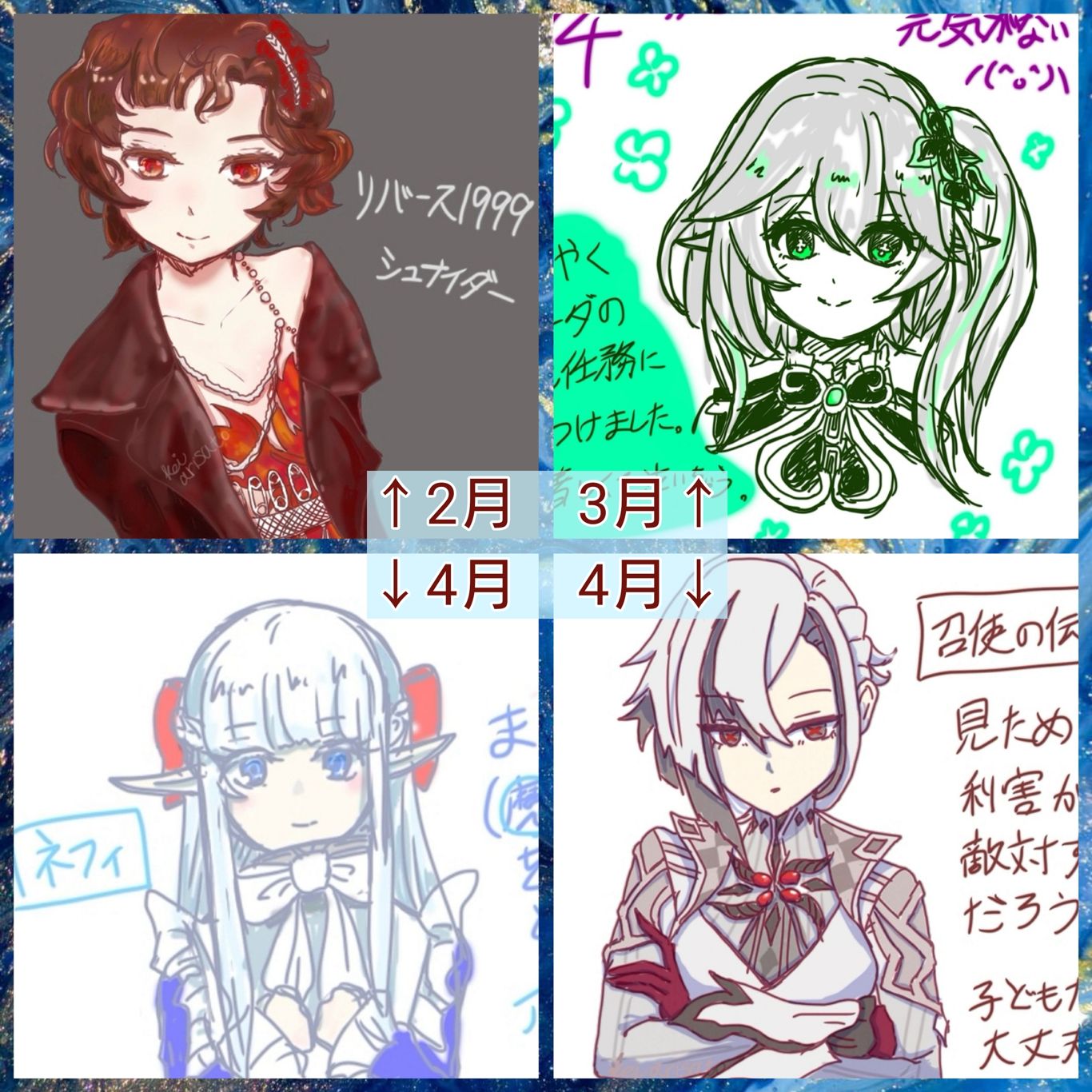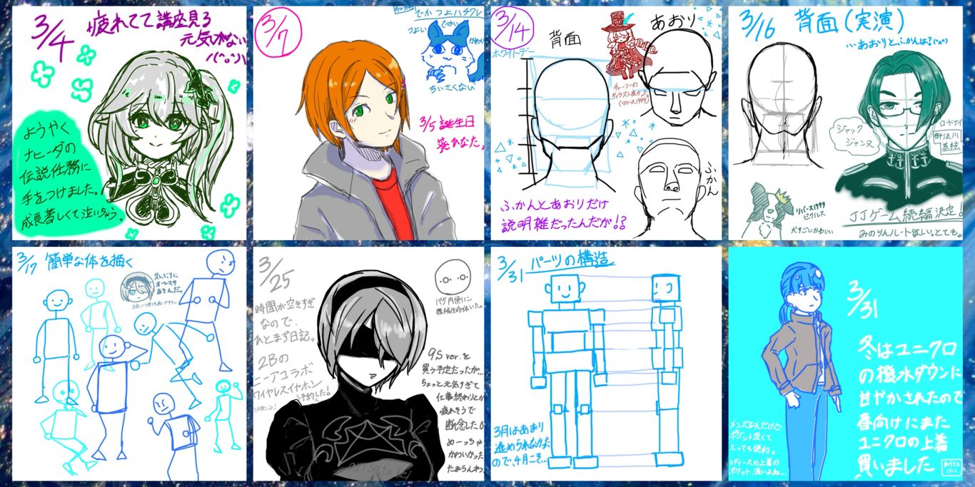 1月がないんですが、2月3月4月と描いてきてちょっとかわいい女の子の造形がわかってきた気がします。